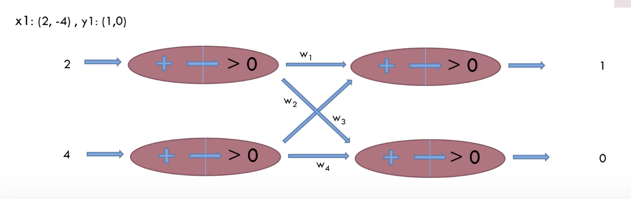 여기서 우리가 원하는 것, 2,-4를 넣어서 더해서 가중치를 곱하면 출력값이 1,0과 가깝게하자