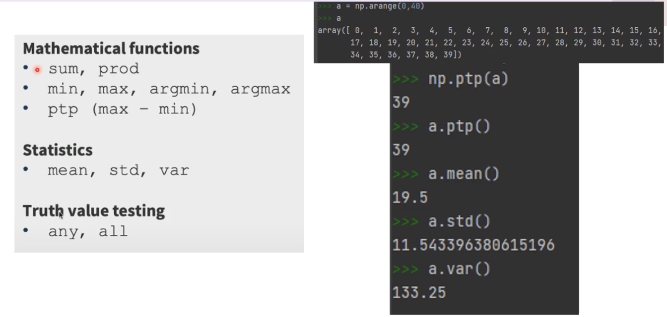 3. 차원이 줄어드는 연산 (mean, std, sum)은 array 전체에 적용된다. 다만, Axis를 줄 수도 있다.